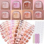 The 216Pcs Press on Toenails feature elegant white French tips with various designs, offering a glossy full-cover look. Made from durable acrylic, these false toenails are easy to apply and remove, providing a salon-quality manicure at home. They enhance nail aesthetics while saving time and effort in traditional nail care