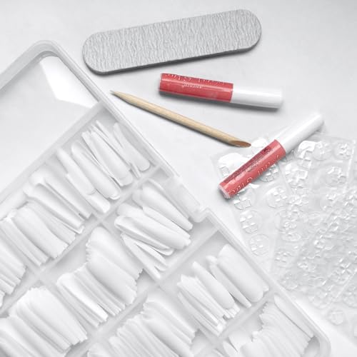 A: You get a lot! The pack contains 240 pieces of white coffin nails in 10 different sizes. Plus, it comes complete with a clear storage box, two 2g nail glues, three sheets of sticky tabs, a nail file, and a cuticle stick. We give you everything you need for press-ons!