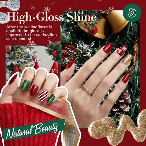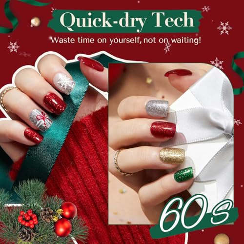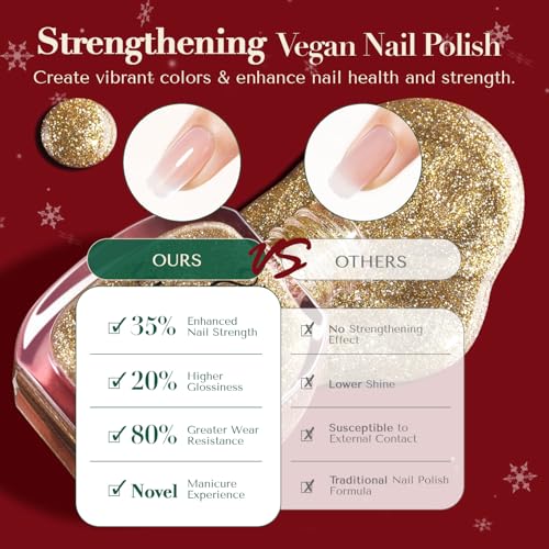 The AZUREBEAUTY Nail Polish Set features four festive colors—red, green, gold, and silver—perfect for Christmas. This quick-dry, vegan formula includes natural ingredients that strengthen nails while providing a vibrant finish. The included top coat enhances durability and shine, making it ideal for DIY salon-quality manicures at home