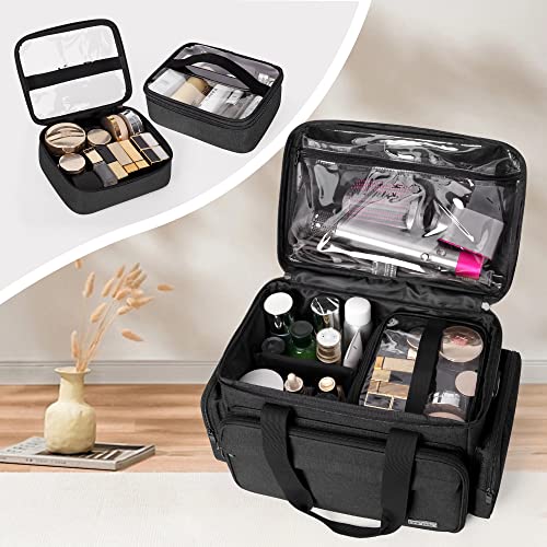 BAFASO Large Black Makeup Bag with 2 Pouches and Adjustable Dividers for Easy Organization