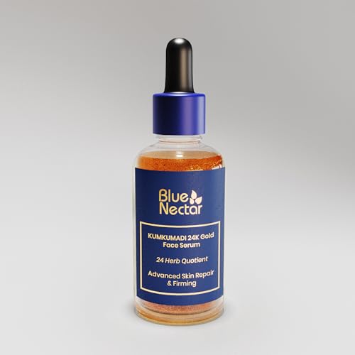 Blue Nectar 24k Gold Serum combines pure kumkumadi oil with 24 potent herbs to enhance skin radiance and reduce signs of aging. Enriched with gold particles, it hydrates and brightens, while ingredients like saffron and sandalwood nourish and rejuvenate the skin, promoting a youthful glow