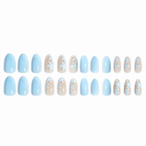MERVF 24pcs Medium Oval Light Blue Floral Press-On Nails for Easy Application