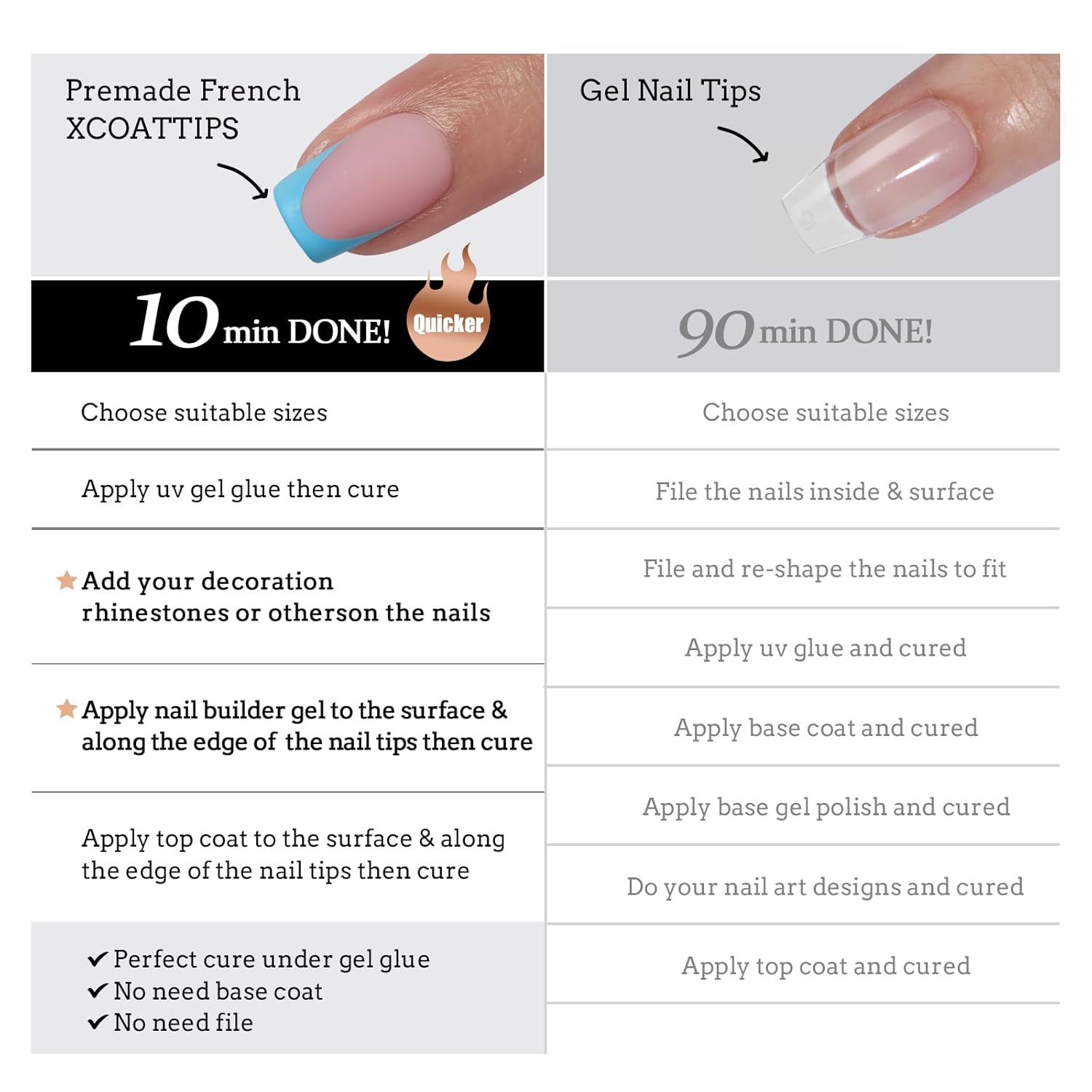 – Time-saving & cost-effective: Pre-applied tip primer and base coat make nail extensions swift and easy, even for beginners. Get salon-quality nails at home in just 10 minutes.