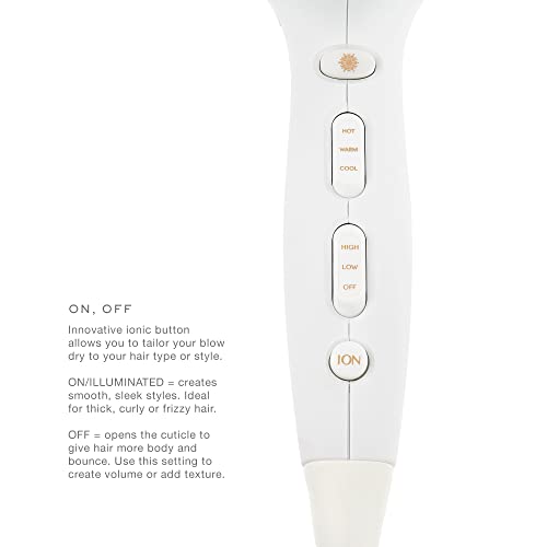 This blow dryer features an innovative ionic button that allows you to tailor your blow dry to your hair type or style. When the button is ON/ILLUMINATED, it creates smooth, sleek styles, which is ideal for thick, curly, or frizzy hair. Turning the ionic button OFF opens the cuticle to give hair more body and bounce, perfect for creating volume or adding texture.