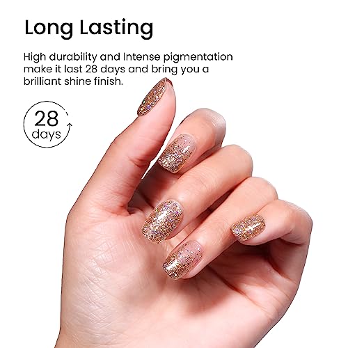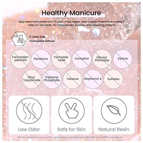 MAYCHAO 15ML Rose Gold Glitter Gel Nail Polish delivers a dazzling, long-lasting manicure with a quick 60-120 second LEAD cure time. Featuring a 9 toxin-free, low-odor formula, it offers salon-quality shine and durability for up to 28 days. |