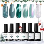 The Modelones Gel Nail Polish set features six Hema-free colors, including white and green, designed for stunning 9D cat eye effects with holographic glitter. Its soak-off formula is easy to apply and remove, promoting healthier nails while providing long-lasting wear and vibrant holiday-themed designs perfect for DIY nail art