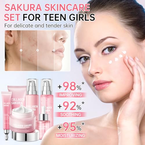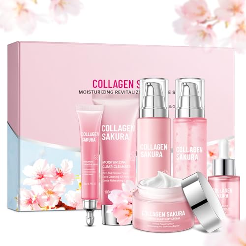 The JAPAN SAKURA Skin Care Set features six essential products infused with cherry blossom extracts, collagen, and hydrating ingredients. This set includes a cleanser, toner, lotion, serum, cream, and eye cream that together moisturize and repair skin while promoting elasticity and radiance for teen girls and women