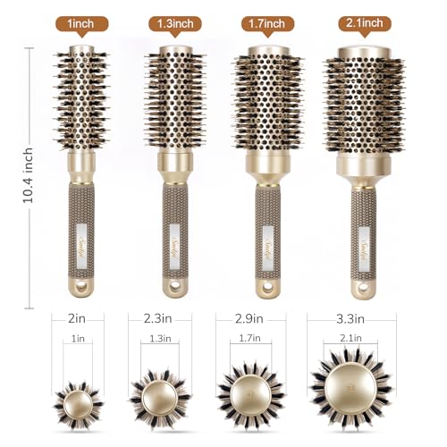 The Sndyi Round Brush for Blow Drying features a 2-inch diameter and a 1-inch barrel, combining nano thermal ceramic and ionic technology with boar bristles. This professional brush enhances styling, curling, and straightening while reducing frizz, promoting shine, and distributing natural oils for healthier-looking hair