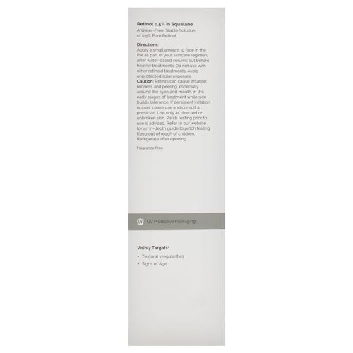 Retinol 0.5% In Squalane Key Features: Strength: A moderate-strength retinol serum that is perfect for experienced retinol users. targets: This formula actively targets signs of aging, reduces dryness, smooths textural irregularities, and evens out the skin tone. Suited Too: Despite its potency,this is designed to suit all skin types with its mindful formulation. |