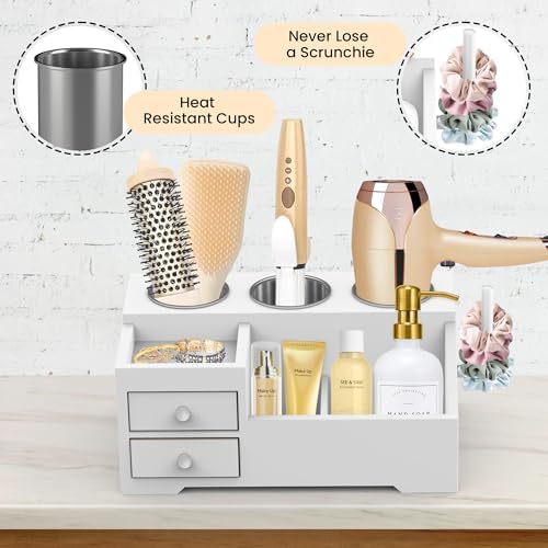 The hair tool organizer is designed for efficient organization, featuring 3 stainless steel cups to safely store and organize hot tools like hair dryers, curling irons, and straighteners. This prevents damage to other accessory items. The bottom organizer is perfect for holding makeup accessories, hair accessories, and more, keeping your vanity top neat and organized.
